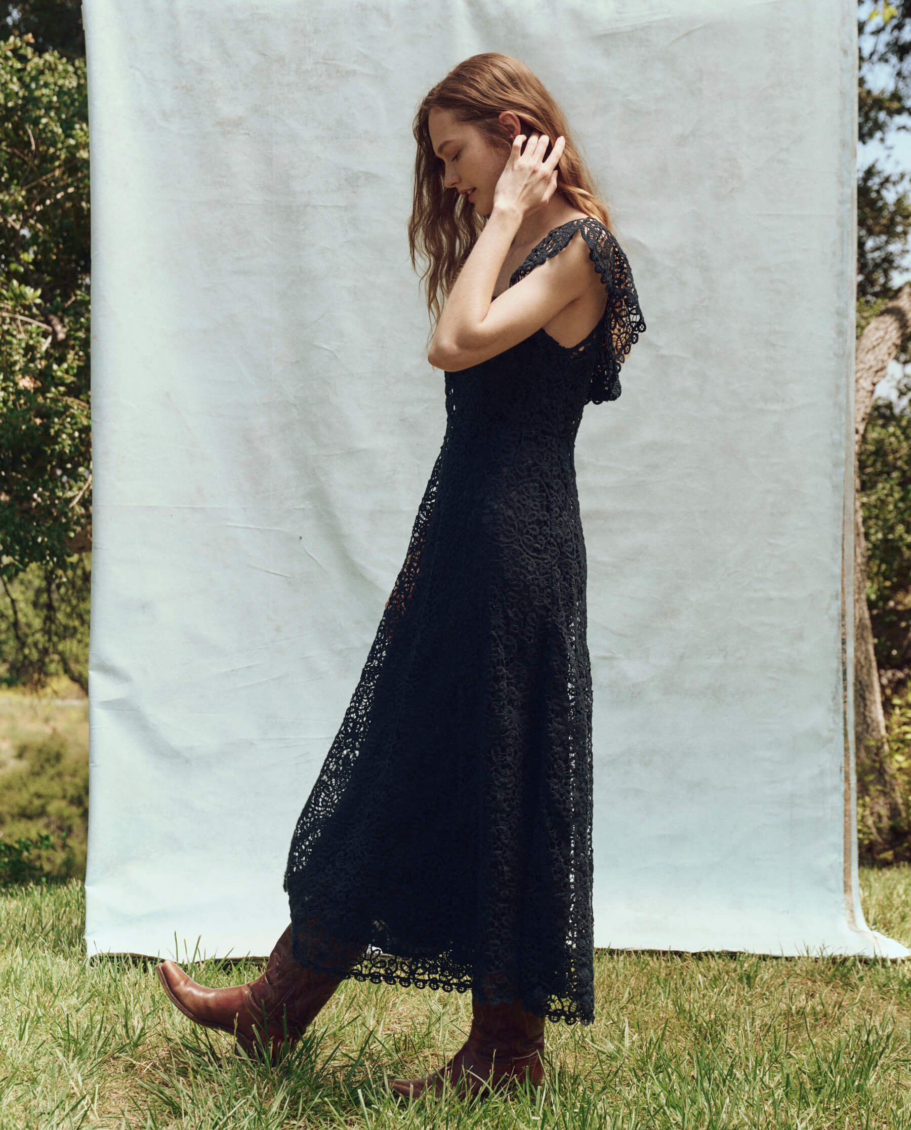 This romantic midi dress is inspired by a 1930s vintage lace find. The heavy lace fabric is made using a chemical burnout process, creating a delicate openwork pattern. It features scalloped lace edges, a fitted bodice, and a square neckline with a ruffled trim. A chunky metal zipper at the back finishes the look with irony and ease.