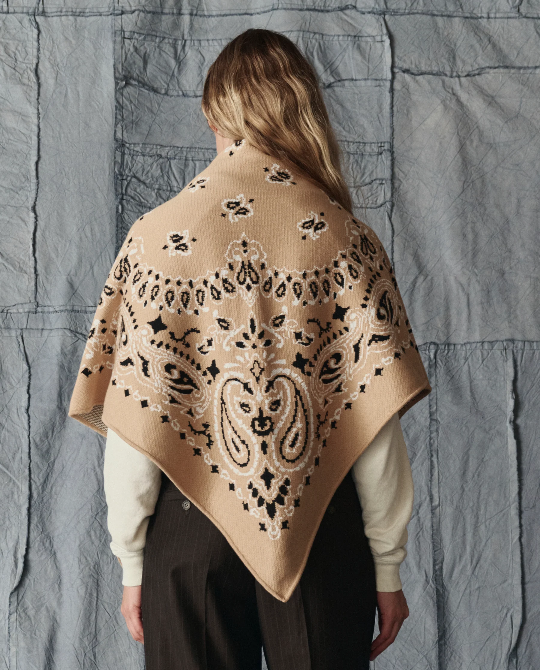 Rooted in vintage Americana style, The Big Bandana Scarf takes its cue from the classic bandana and reimagines it as an oversized, blanket-like wrap. Knit using a traditional jacquard technique, it features a blown-up vintage bandana motif for a bold, graphic take on a timeless favorite. The fun is in the styling—throw it over your shoulders, wrap it as a scarf, or wear it belted like a shawl. Choose your own adventure and make it your own.