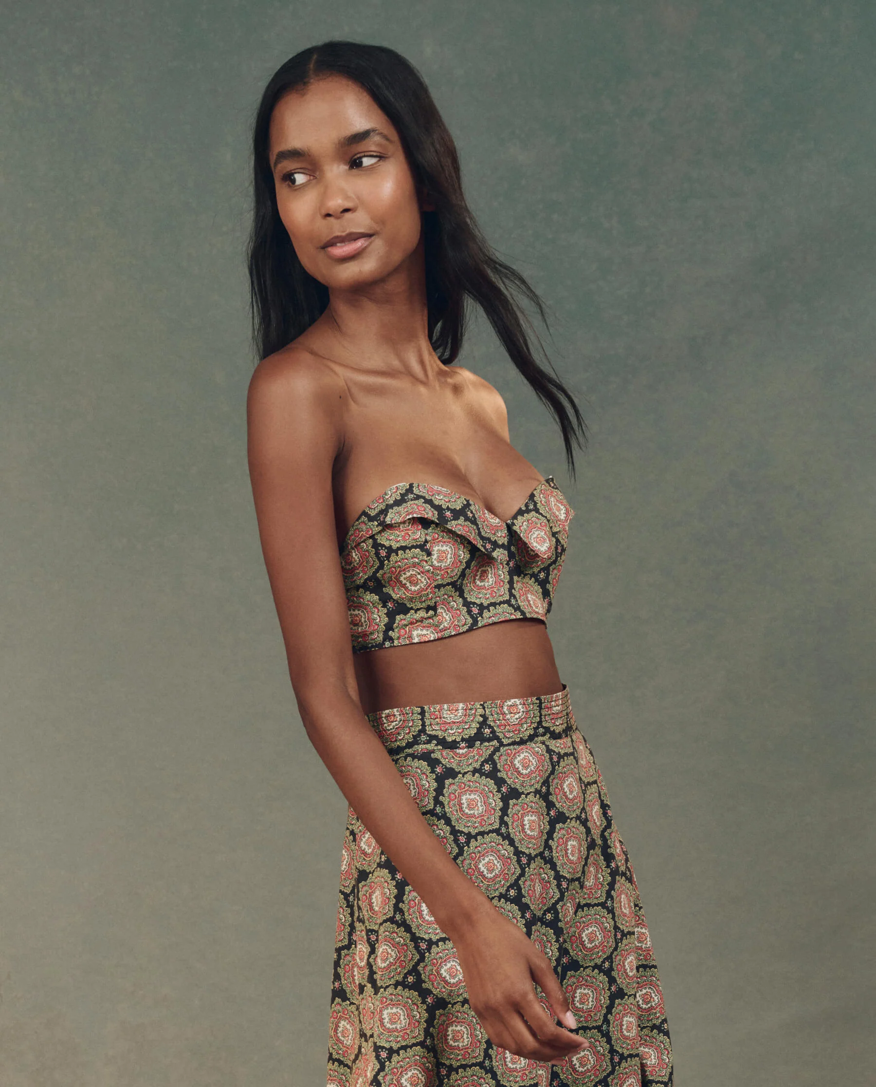 Inspired by 1940s silhouettes, this bustier-style top features a classic sweetheart neckline and side-seam boning for structure. Thoughtful details like an elasticated back strap with an adjustable button closure and removable straps offer customizable comfort and versatile wear. We love this as a matching moment with the Windsor Skirt in Heirloom Pasley or on its own with almost any bottom.