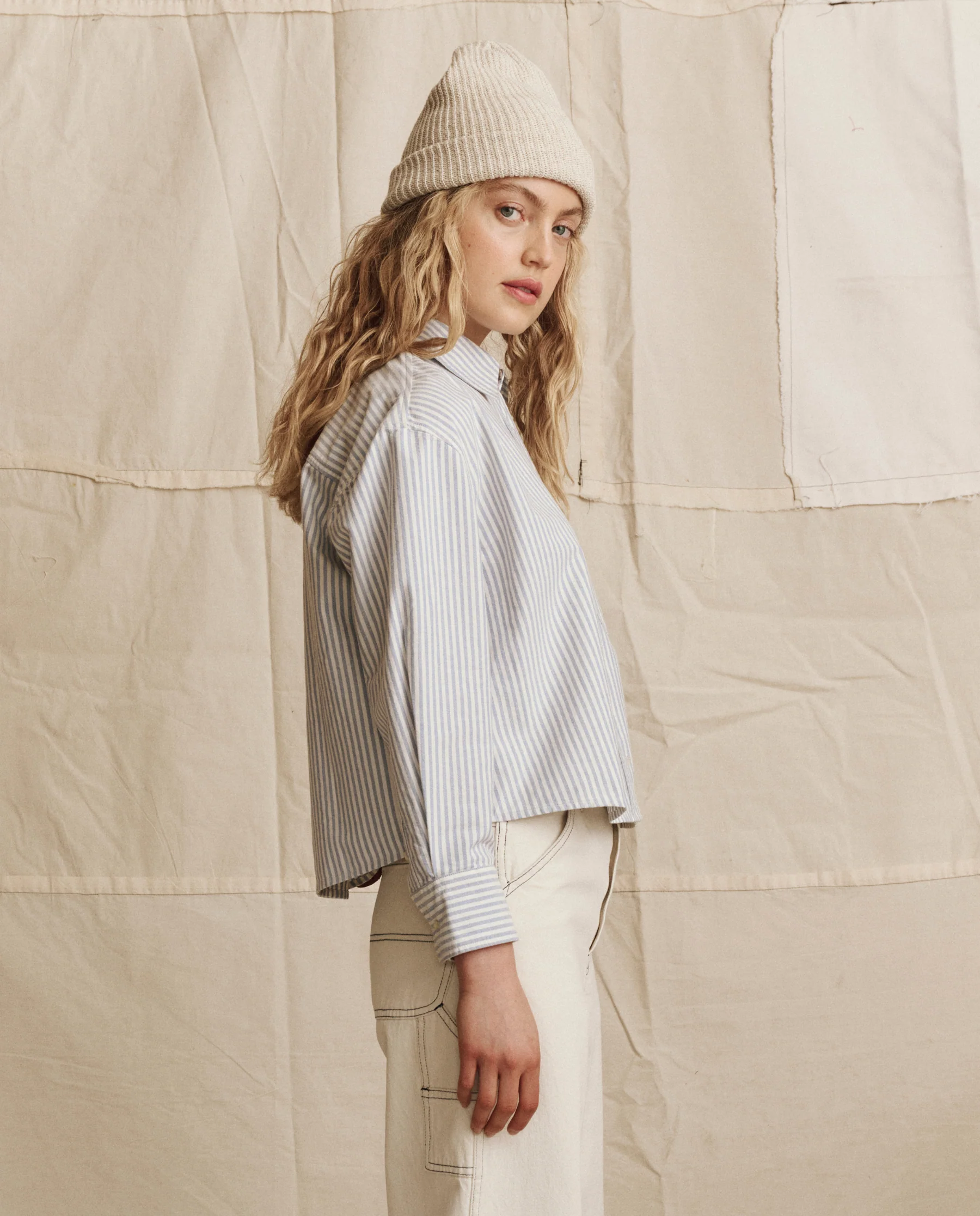 The Cropped Oxford Shirt. -- Soft Blue Stripe