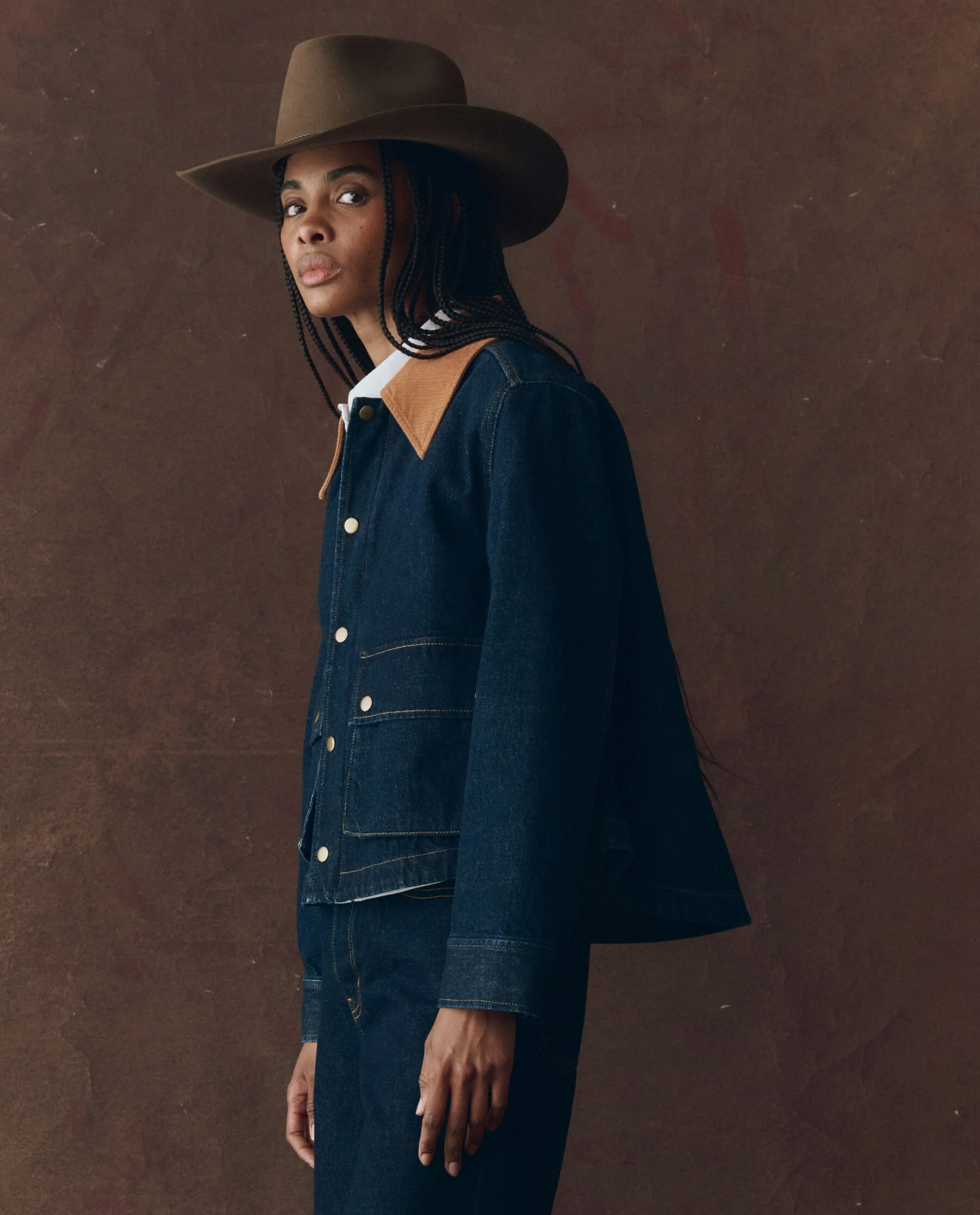 Inspired by heritage-style barn jackets, this reproduction has been reinterpreted with more interesting proportions. It features a cropped length that is longer at the back, creating a charming swing shape. The jacket is made of a structured rinse denim with a corduroy collar that adds authentic detailing. It also includes a snap-front closure with a hidden front zipper, along with traditionally pleated, three-dimensional pockets and snaps at the flap closure.