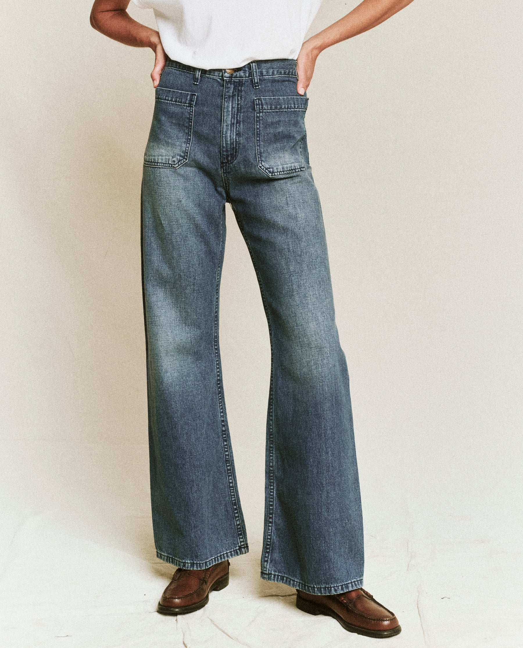 The Dock Jean. is an update to a timeless pair that transcends seasons. Reminiscent of ‘70s denim, this new bell-shaped sailor jean is high-waisted with the most charming kick that hits just below the ankle. The leg inseam features a subtle horseshoe shape for a flattering leg, sailor patch pockets, and a zip fly with metal button closure that completes the look that you can take day to night.