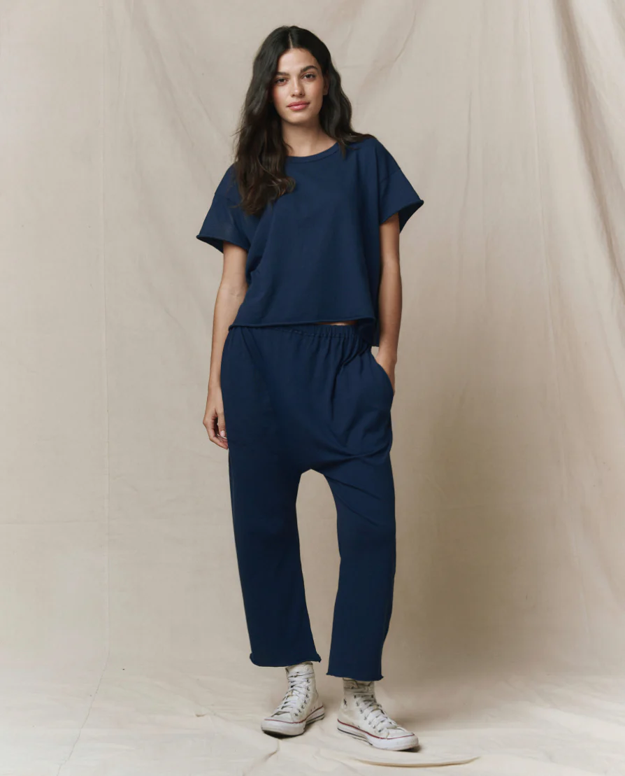 A look all its own, The Jersey Crop. is an elastic waist jersey pant with our signature dropped rise and a wider straight leg. The ultimate in casual, we love this pant with a tee and sandals. Handcrafted locally in Los Angeles, our process ensures beauty and uniqueness—no two pieces are alike.