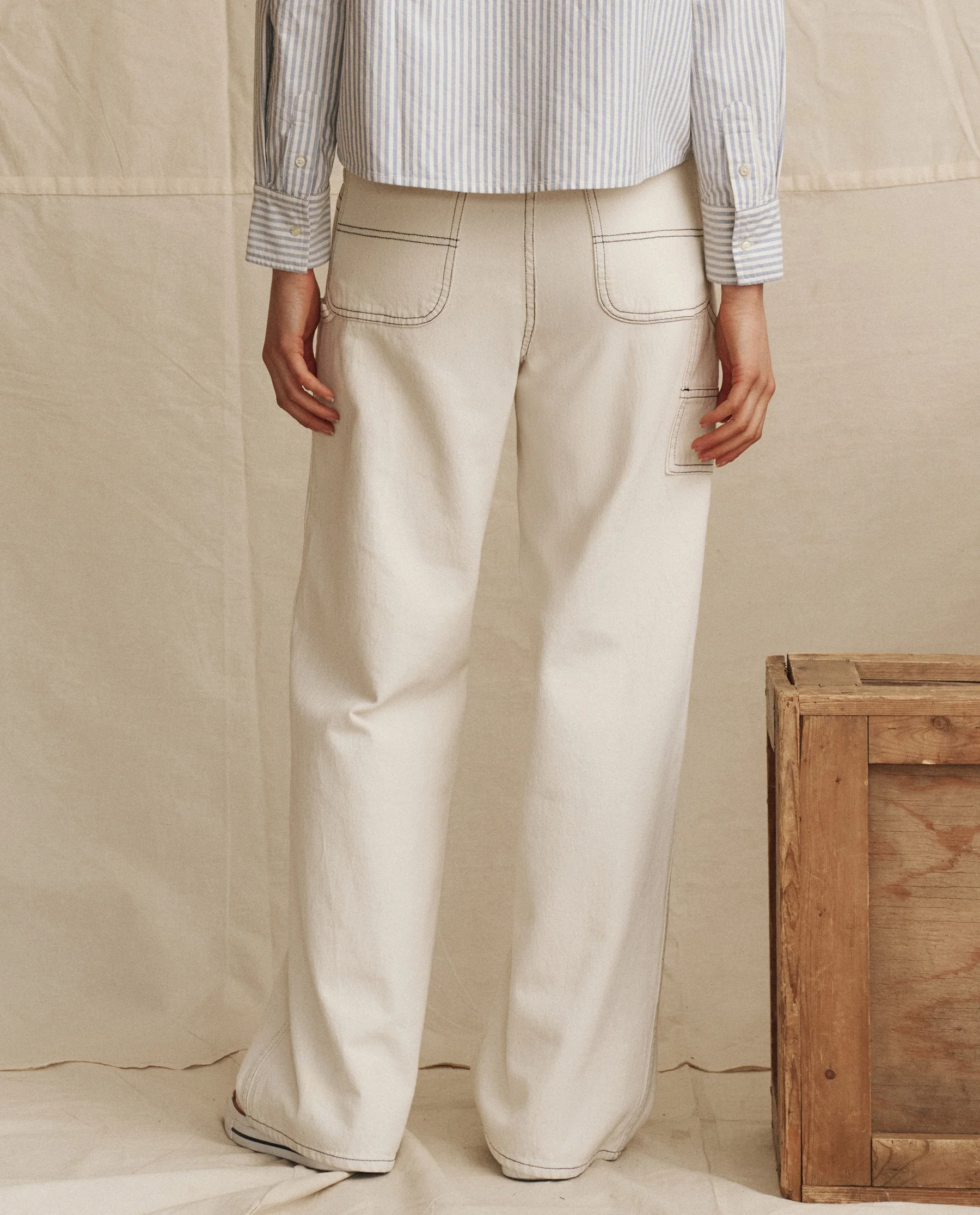 The Mill Jean in Natural with Navy Stitching is rooted in classic workwear, combining a slouchy mid-rise fit with traditional carpenter detailing. Features include slanted front pockets, rounded back pockets, a side tool pocket, and double-needle stitching throughout. Finished with a metal snap waistband and zip fly. Made in Los Angeles from lightweight, undyed cotton–hemp denim with contrast navy stitching. The long inseam lends a relaxed, slightly oversized proportion.