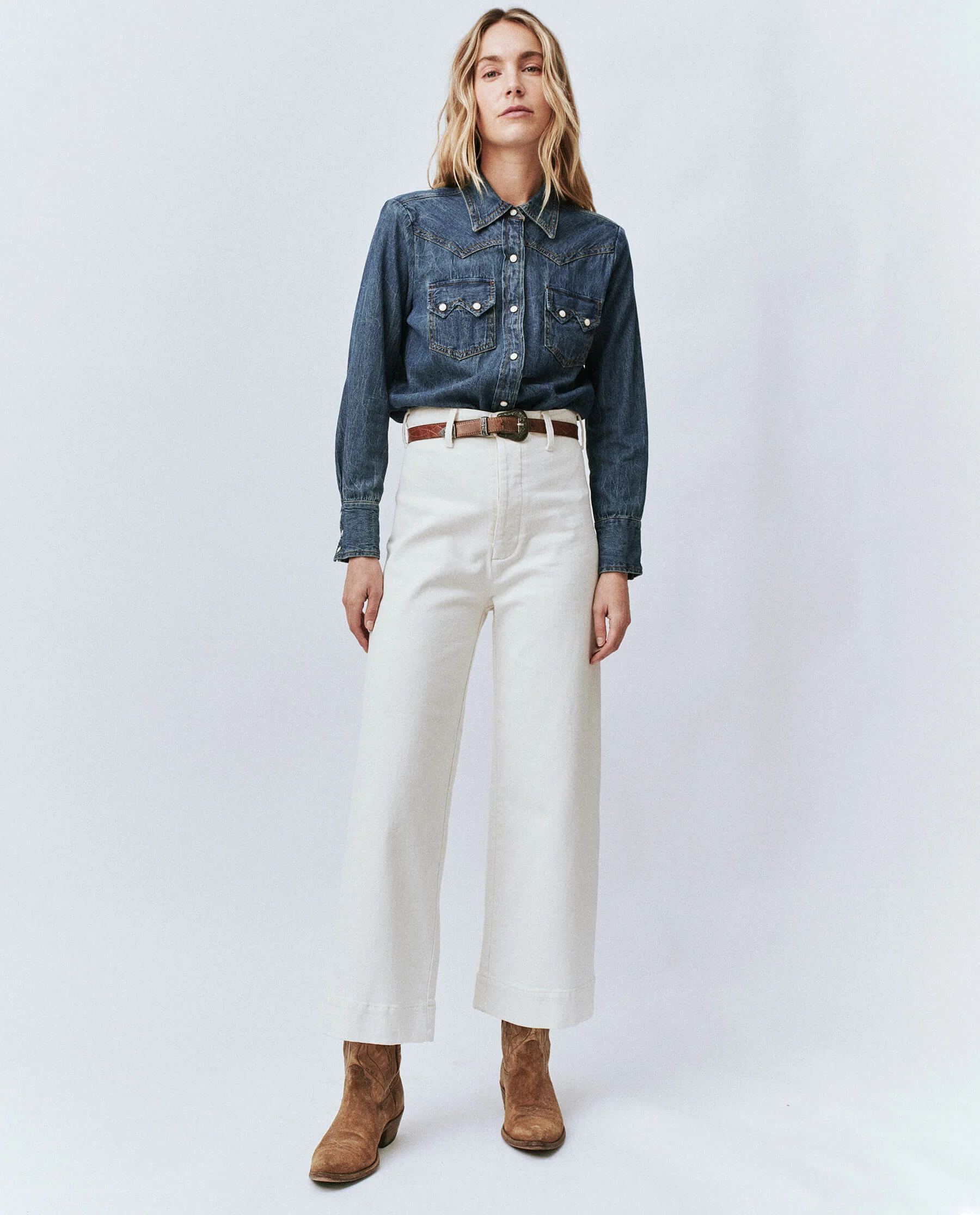 Inspired by a vintage sea pant worn by mariners, The Seafair Jean. sits ultrahigh on the waist, fits slim through the hips and eases into a wide leg. Authentic characteristics like darts and workwear pockets plus a button front fly make this pant extra special.