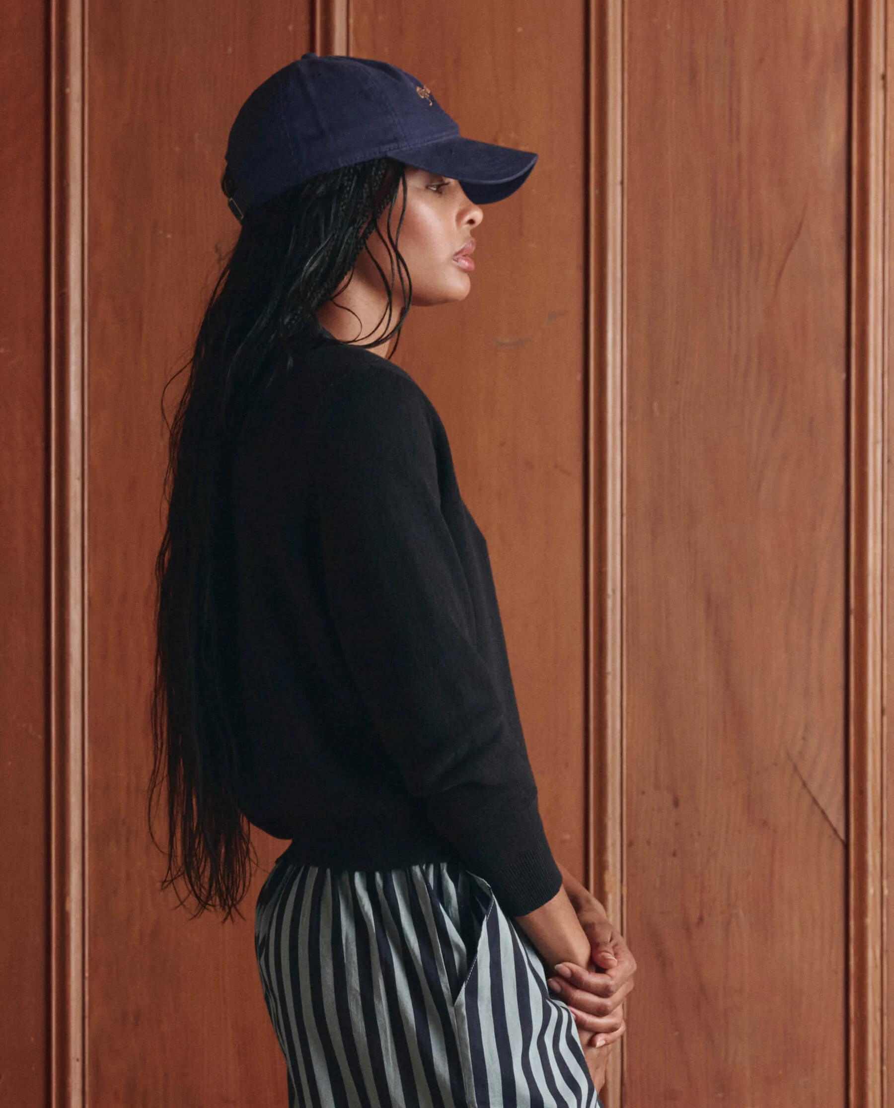 The Shrunken V-Neck Cardigan is inspired by vintage menswear cardigans, reimagined in smaller proportions. The silhouette is boxy with a cropped body length and sleeves designed to hit just above the wrist. It features a classic V-neckline with a clean finished edge, horn buttons, and delicate ribbing at the cuffs and hem. This season, it's knit from a fine-gauge cotton yarn in a classic black.